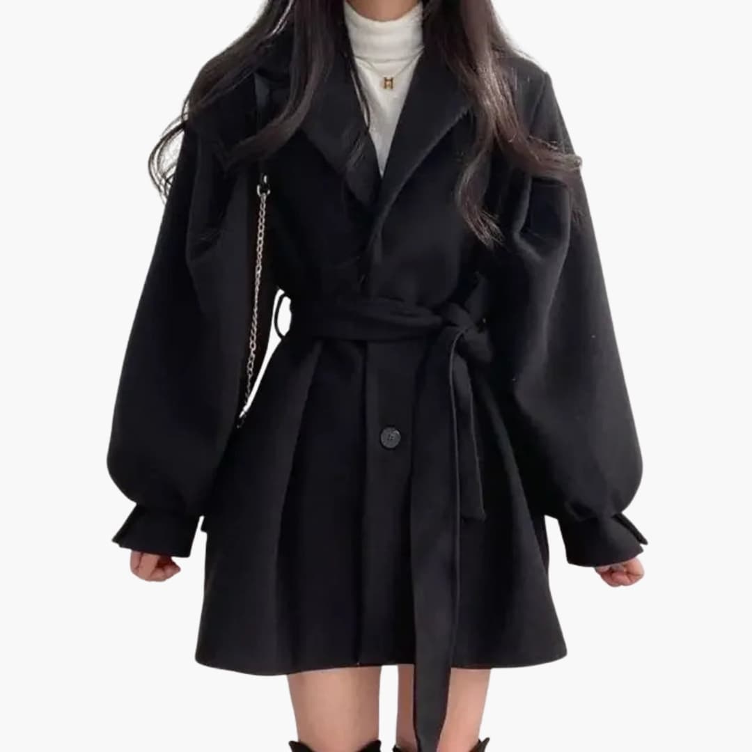Women’s Short Trench Coat with Waist Belt and Long Puff Sleeves.